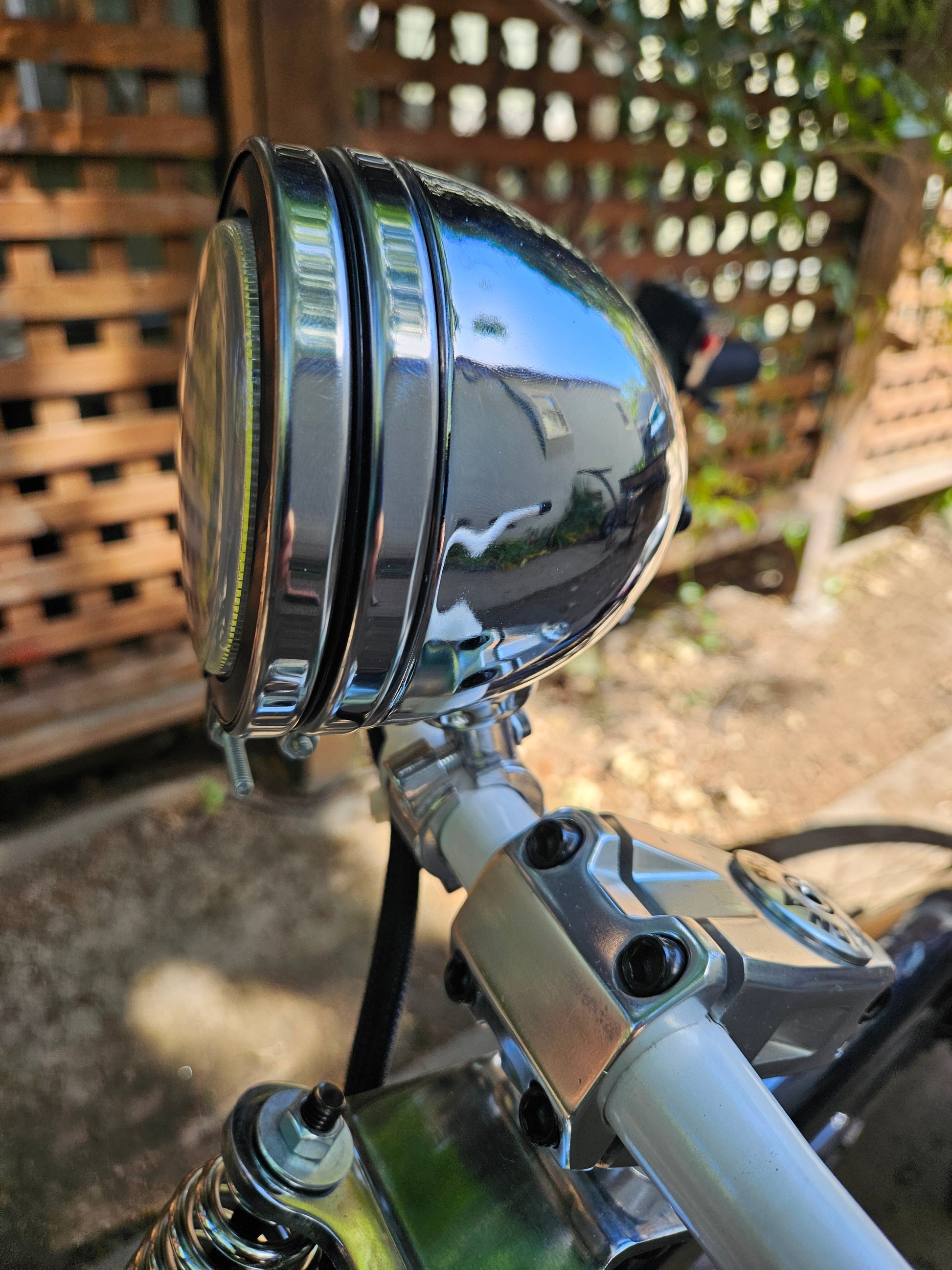 Our 4" LED Cruiser Headlight is a smaller version of the cruiser headlight. Comes in your choice of Chrome or Black housing. This headlight packs a punch with a bright white LED central bulb and a bright white LED COB Halo. The lithium ion battery will keep you going with up to 10 hours runtime on a single charge. Includes battery charger and correct size mount brackets for your bike.