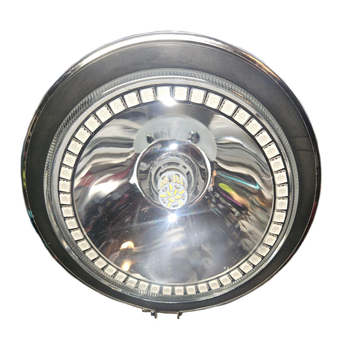 Step up to The Superior Cruiser Headlight in your choice of Chrome or Black. Featuring a bright white LED central bulb with 1200 Lumens. RGB Color Changing LED Halo with remote control. The lithium ion battery will keep you going with up to 8 hours runtime on a single charge. Includes battery charger and correct size mount brackets for your bike.